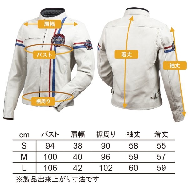 デグナー DEGNER 春夏モデル レザージャケット レディースサイズ:Sカラー:ホワイト素材:やぎ革メンズでも人気のトリコロールカラーレザージャケットのレディースバージョン。バイクスタイルと合わせてフルコーディネート。肩・ひじ・背中・胸にはプロテクターを標準装備。【本革の特徴について】デグナーのレザーウェアは、完全な天然皮革を使用しております。天然皮革であるために、素材の表面に細かい傷・班・血栓等による色ムラが見られる事があります。これらは天然素材である証であり、皮革製品ならではの特長です。上記の点を素材の特徴としてご理解下さい。永くご愛用して頂く為に定期的なお手入れをお勧めいたします。皮革の染色には特に注意しておりますが、現在の染色技術では完全に色落ちしない染色は完成しておりません。汗・水・摩擦日光等で色落ち・色移り・変色する場合がございますので、ご着用時はご注意ください。