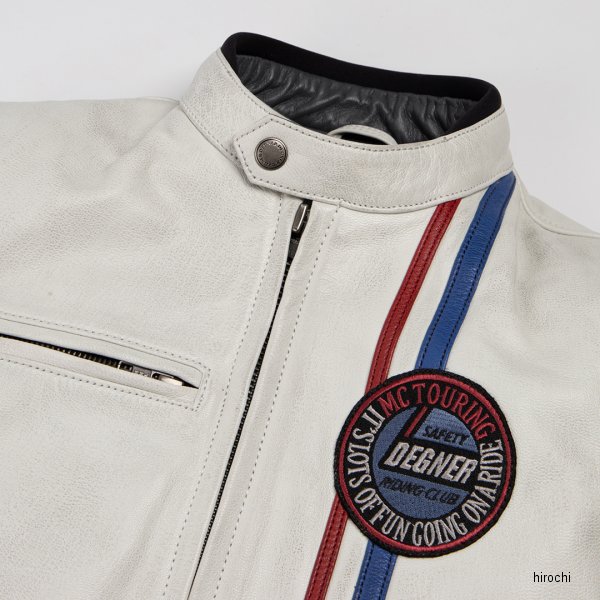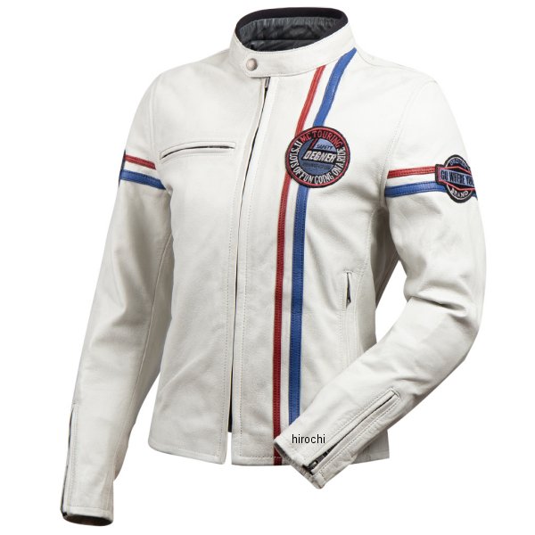 デグナー DEGNER 春夏モデル レザージャケット レディースサイズ:Mカラー:ホワイト素材:やぎ革メンズでも人気のトリコロールカラーレザージャケットのレディースバージョン。バイクスタイルと合わせてフルコーディネート。肩・ひじ・背中・胸にはプロテクターを標準装備。【本革の特徴について】デグナーのレザーウェアは、完全な天然皮革を使用しております。天然皮革であるために、素材の表面に細かい傷・班・血栓等による色ムラが見られる事があります。これらは天然素材である証であり、皮革製品ならではの特長です。上記の点を素材の特徴としてご理解下さい。永くご愛用して頂く為に定期的なお手入れをお勧めいたします。皮革の染色には特に注意しておりますが、現在の染色技術では完全に色落ちしない染色は完成しておりません。汗・水・摩擦日光等で色落ち・色移り・変色する場合がございますので、ご着用時はご注意ください。