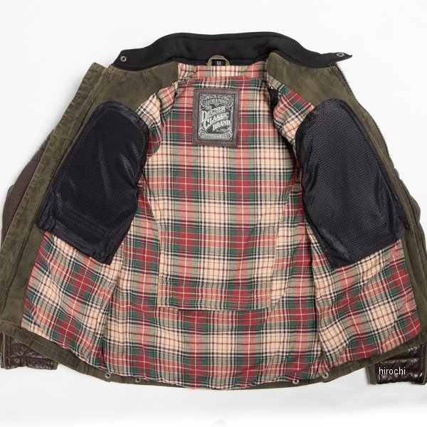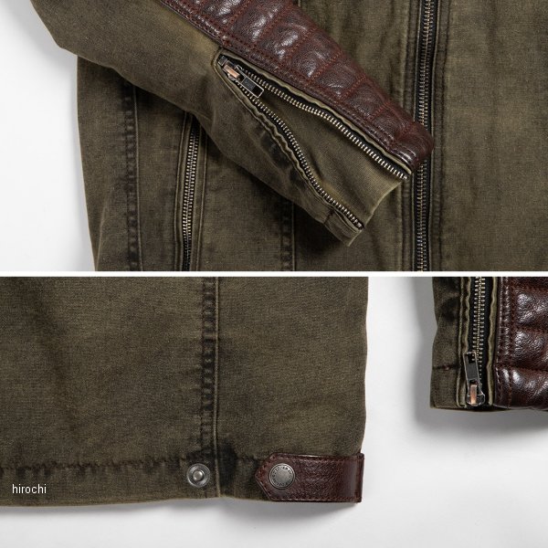 デグナー DEGNER 春夏モデル テキスタイル&レザーコンビジャケットサイズ:XLカラー:カーキ/ブラウン素材:コットン/牛革ウォッシュ加工を施した渋い風合いのコットンと、牛の中でも頑丈なバッファロー革を使用したコンビジャケット。肩から袖にかけての牛革はデザインのアクセントだけでなく、転倒時の備えにもなる。カラーごとに異なるインナーもこだわりポイント。天然素材・コットンを使用。通気性・吸水性に優れ、汗をしっかり吸収&発散するので、サラサラの着心地。牛革は、バイク乗りが愛するライダースジャケットをはじめ、ライダースアイテムに多く用いられている素材。堅牢で耐久性が高く丈夫。