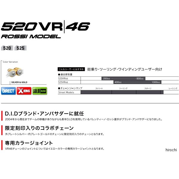 D.I.D 大同工業 チェーン 520VR46シリーズチェーンサイズ:520リンク数:112Lジョイントタイプ:ZJ(カシメ)カラー:シルバー/ゴールド【仕様説明】・外プレートはシルバー内プレートはゴールドを採用・ジョイントにはVR46をモチーフにしたイエローの専用カラー・チェーンサイズは520/525サイズのみとなります。