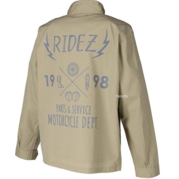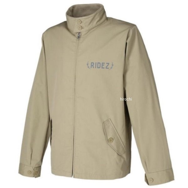 ライズ RIDEZ P&S SWING TOPサイズ:Mカラー:ベージュ【仕様説明】表地は、ポリエステルの耐久性と綿の快適性を兼ね備えた型崩れの少ないT/Cウェザー。立ち襟のリブ使いにより厚みが増した美しいシルエットです。リブは毛玉ができにくく、肌ざわりも滑らか。袖口に備えたカフスボタン2つによる調整が可能で、もたつきを防ぎます。 ファスナーはYKK社製シングルスライダー。背中のプリントはモーターサイクルカンパニーらしくバイクパーツのイラストが描かれております。