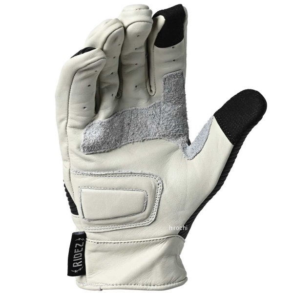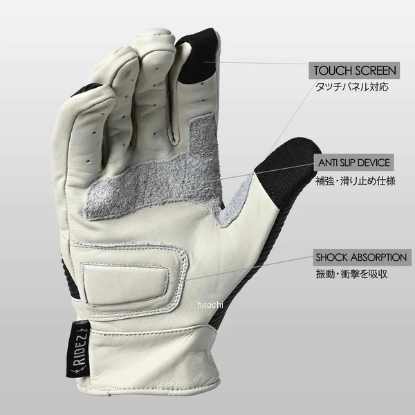 ライズ RIDEZ MOTO GLOVES VOLTAGE レザーグローブサイズ:Lカラー:ホワイト/ブラック【仕様説明】ヨーロッパ・ブリテシッシュデザインをコンセプトに制作しました。シリーズの中でひときわ目立つシャーリングです。レザーをジャバラ状縮め加工する事で、グローブが綺麗な曲線カーブを描き、自然とグリップが握りやすい形になっています。コンチョボタンには、RIDEZの新しいロゴを刻印、細部にはRIDEZのタグを配置しました。サイズ調整には、ベルクロは(マジックテープ)あえて使わず、ボタンとファスナーを採用しました。耐久性も高く長年愛用して頂けるように細部まで拘った手袋です。・操作性-グリップーグローブを制作する際に1番拘っている事は握り心地です。レース用グローブを制作している時から変わらず、握りやすい「運転しやすい」グローブに拘ってきました。握りやすく疲れにくいのが特徴です。・タッチパネル対応スマホを操作する「親指」「人差し指」はタッチパネルに対応しています。手袋をつけたままでも操作可能で秋冬の寒い時期に特に活躍します。最近ではガソリンスタンドやコンビニなどでのスマホ決済が定番化しており、手袋を取らずに、すぐに操作できると好評です。・牛革グローブ素材のポイントとして柔軟性と耐久性があります。繊細なクラッチ操作・ブレーキングに必要な柔軟性、ライド中は常に稼働し摩耗に耐える耐久性です。両方を兼ね備えた素材として、牛革を採用しました。質感に拘り、落ち着いた光沢がある革を厳選し使用しました。