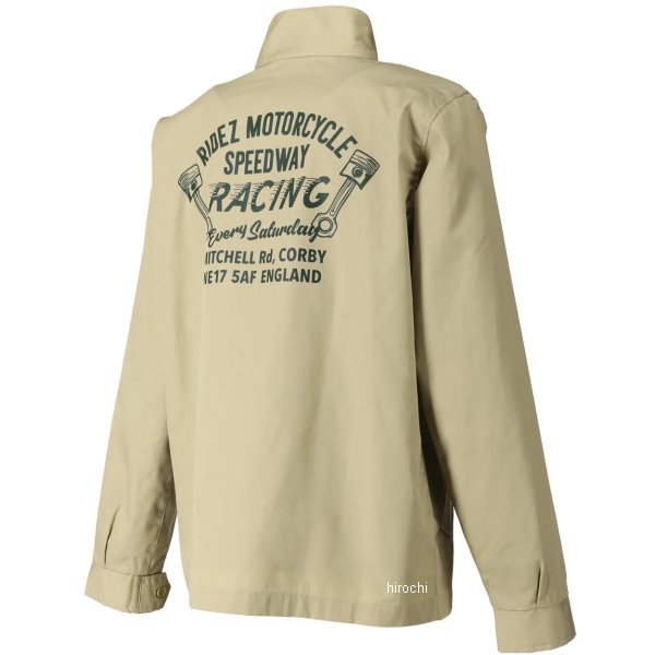 ライズ RIDEZ RACING スウィングトップサイズ:XLカラー:ベージュ【仕様説明】RACING SWING TOPはフロントにフラッグとSPEEDWAYRIDEZが描かれています。フラッグをよく見ると、RIDEZのロゴが描かれており、ライズの魂が宿ったデザインとなっています。背面にはピストンがデザインされスピード感あるデザインに仕上げました。ライド以外にも普段使いできるおしゃれなアウターです。・さらっと着こなせるアウターちょっとコンビニまで行く時や、近場まで出たいと時などに便利なアウターです。厚すぎず、薄すぎず、春・秋に活躍するちょうどイイアウターです。・T/Cウェザー(型崩れしにくい素材)バイクウェアーとして耐久性がある素材に拘りました。今回表地は、ポリエステルの耐久性と綿の快適性を兼ね備えた型崩れの少ないT/Cウェザーを採用。防止しわ効果があり、洗濯をしても縮みにくい仕様となっています。・立ち襟立ち襟に拘りリブに厚み増しました。そうする事で、横に倒れる事無く、美しい襟元を再現しました。リブは肌触りがいいように素材にも拘り、肌ざわりも滑らかです。袖口に備えたカフスボタン2つによる調整が可能で、もたつきを防ぎます。