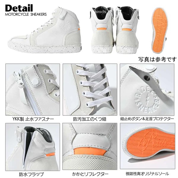 ライズ RIDEZ バイクスニーカー MOTO-MAX2サイズ:25.5cmカラー:ホワイト【仕様説明】MOTOMAXは、細部に渡って見直しを図り、様々なシーンで毎日履けるスニーカーになりました。バイク用でありながら、普段からご愛用頂けるシューズです。シンプルを極限まで、追求することで、真の美しい豊かなデザイン。素材に拘り、質感をあげ、ロゴを刻印にする事で、デザインを邪魔することなく、究極のシンプルなバイクシューズが誕生しました。・シンセティックレザーMOTOMAX2はシンセティックレザー+本革のハイブリットで構成されています。耐水性があり、突然の雨でも全く問題無くご利用頂けます。耐水性にすぐれていますので、雨に濡れる事無く快適なライドを実現できます。防汚にも対応しており、汚れにくく、きれいな状態を維持します。メンテナンスフリーなので、普段使いしやすいアイテムです。・くつひも(防汚れ加工)MOTOMAX2では靴紐にも拘りました。フッ素系の特殊加工をする事で、撥水性に優れ、汚れにくく靴紐へのダメージを減らす事に成功しました。・サイドジップMOTOMAX2では、日々お使い頂く事を想定し、脱ぎ履きしやすいように、サイドにジップを設置。これによりフィット感はそのままで、靴紐を結ぶ手間を大幅に減らしました。・YKK製 止水ファスナーMOTOMAX2にYKK止水ファスナーを採用。履く度に上下するチャックはかなりの負荷が掛かっています、また、ライド中の突然の雨や風などバイクのハードシーンでは通常のチャックでは破損する可能性があるため、MOTOMAX2ではYKK製に拘って採用しました。・ステップキャッチライディングポジションの際にソールが自然とステップがひっかる構造になっています。そのため楽なライディング姿勢を維持する事ができます。また、ステップ滑り防止機能にもなります。・高い視認性MOTOMAX2は、視認性に注目し、ソールはオレンジの蛍光色にしました。少しでも目に留まりやすいカラーにする事で、事故の抑制につながります。・プロテクター一見普通のハイカットに見えますが、実はくるぶしの刻印のあたりには、特殊なプロテクターを内蔵しています。たとえ立ちゴケでも、バイクに挟まれてケガしやすい部分なのです。見た感じはほとんど普通の靴と変わりませんが、バイク専用設計となっており、安全面もしっかりと考えられた商品です。・プロテクションミッドソール茶色ソールには、通常のソールと異なり、特殊な形状になっています。2枚構造となっており、中には形状を維持できるように特殊合金を内蔵。ハードなシーンでも、靴の形を維持し、いざと言うときにあなたの足を守ます。