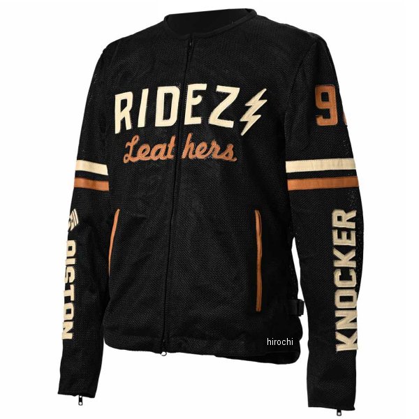 ライズ RIDEZ PISTON KNOCKER メッシュジャケットサイズ:XLカラー:ブラック【仕様説明】PISTON KNOCKERとはピストンが砕けるまで走るというメッセージがあり、レーサーの血が騒ぐようなクラシカルジャケットをコンセプトに新しくデザインを書き下ろしました。バイク好きの心をくすぐるワークスカラーは、見てすぐにバイクを連想させます。スタイリッシュでスピード感あふれるロゴは、素材に本革レザーを採用し、一つ一つ丁寧に刺繍しました。袖にもピストンデザインがアクセントとなり、ネオクラシックスタイルになっています。細部まで拘ったデザイナーのRIDEZ魂を感じる1着です。・ノーカラーノーカラーとは襟が無い事です。着用時首回りの圧迫感が無くライダースジャケットとして適した形です。襟が無い分、開放感があり涼しく真夏でも快適です。・ネオプレーン素材襟元や袖口はごわつくメッシュではなく、ウェットスーツなどで用いられるネオプレーン素材を使用。肌触りが良く柔らかい事が特徴で、肌に接触する部分の摩擦を軽減します。・ラウンドテール一般ジャケットではライディング姿勢になった際に腰が見えてしまう事も。ラウンドテールは通常より背中部分の丈が長く作られているので背中が見えにくい仕様となっています。・アジャスター バタつき防止裾下にはバタつき防止のベルクロテープ(マジックテープ)があります。・プロテクターポケット胸、背中、肩、肘にはプロテクターポケット配置しています。