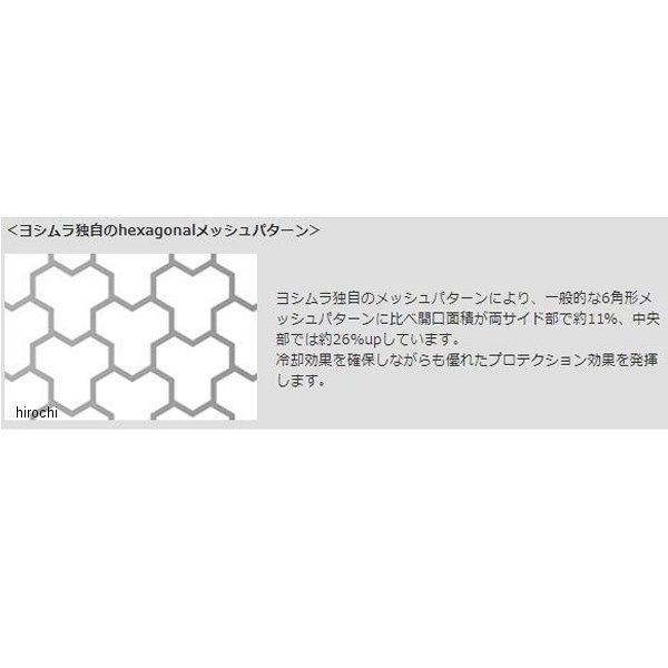 ヨシムラ ラジエター&オイルクーラーコアプロテクター22年-23年 スズキ GSX1300Rハヤブサ【セット内容】・ラジエターコアプロテクター・オイルクーラーコアプロテクター【仕様説明】・フロントタイヤから巻き上げた小石によるラジエターへのダメージや空中ダストがもたらすラジエターフィンの詰まりを最小限に抑えます。・巻き上げが集中しやすい中央部は細かいメッシュパターンにすることで確実にガード。・両サイドは通風性を優先し粗めのパターンに仕上げています。・冷却効率と保護性能の両立を考慮した開口率になっています。・経年変化や錆に強いステンレス(SUS304)を採用。板厚 t=0.8mm に設定し軽量ながら耐久性を確保しています。