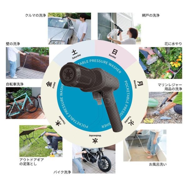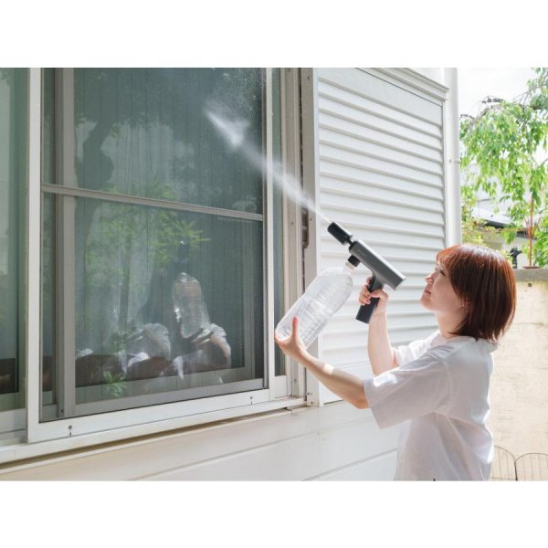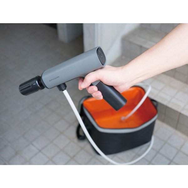 サインハウス SPICERR スパイサー SWU-201 ポケッタブル高圧洗浄機 ブラック超コンパクト設計:折りたたむと約176×104×68mm。重量わずか約800gで携帯性抜群。充電式バッテリー内蔵:USB-C充電対応のリチウムイオンバッテリー(2500mAh)搭載。屋外でも電源不要。水源不要:水道直結不要。バケツや2Lペットボトルから簡単給水可能。3段階の水圧調整:強モード:約1.0MPa(使用時間:約14分)中モード:約0.7MPa弱モード:約0.5MPa(使用時間:約30分)5種類の噴射モード:0°(直線ジェット)、15°、25°、40°、シャワーバイクや自転車の洗車キャンプ用品の清掃ガーデニング(散水)網戸や外壁など家庭用清掃アイデア次第で様々な用途にご利用頂けます。