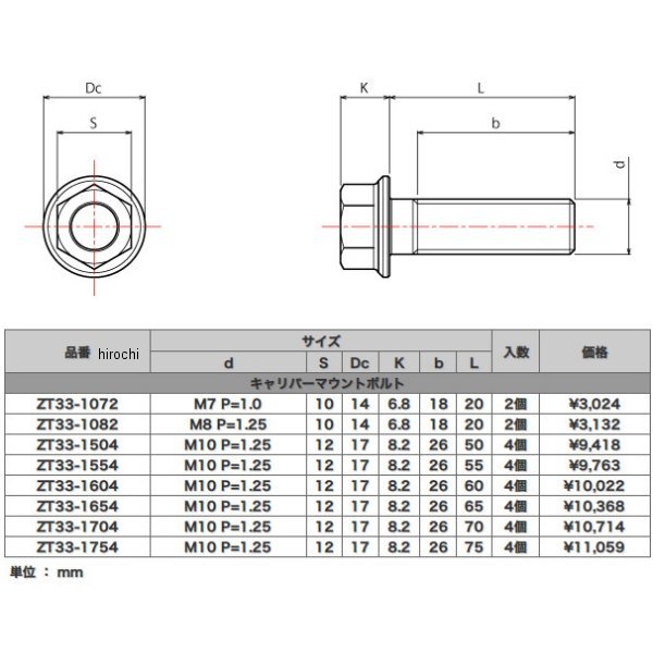ジータ ZETA チタンキャリパーマウントボルト汎用タイプ:ラジアルマウント【サイズ】・d:M10 P=1.25・S:12mm・Dc:17mm・K:8.2mm・dS:26mm・L:60mm入数:4本入り