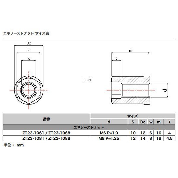 ジータ ZETA チタンエキゾーストナット汎用【サイズ】・d:M8 P=1.25・S:12mm・Dc:14mm・w:8mm・m:18mm・t:4.5mm入数:8本入り