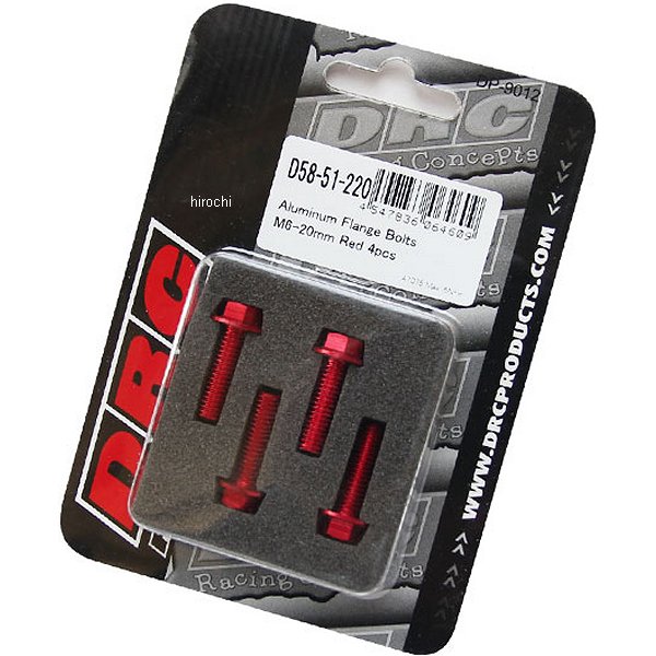 ディーアールシー DRC M6 アルミフランジボルト 20mm汎用素材:アルミ入数:4個カラー:レッド※熱の加わらない箇所に使用してください。※締め付けトルクは、メーカー発行の各車使用サービスマニュアルを参照して下さい。7000系アルミニウムを更に粘り強くさせる鍛造製法と、精度なネジ山部の加工に不可欠な転造製法をすることで、引っ張り強度に優れ、緩みにくい超軽量アルミボルトが完成。純正スチールボルトより約50%以上軽量。ボルト頭部は美しい切削加工し、表面処理は耐腐食性に優れるアルマイト加工を施す。組み合わせて使える軽量アルミスペーサーも各種ラインナップ。・推奨する締め付けトルク:M6ボルト・・・・・・0.6kg-m