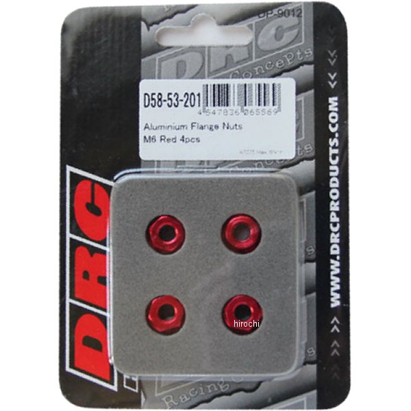 ディーアールシー DRC アルミフランジナット M6汎用カラー:レッド素材:アルミ入数:4個※熱の加わらない箇所に使用してください。※締め付けトルクは、メーカー発行の各車使用サービスマニュアルを参照して下さい。M6サイズの7000系アルミニウムフランジナット。1セット : 4個入りまたは20個入りをラインナップ。・推奨する締め付けトルク:M6ナット・・・・・・6N・m
