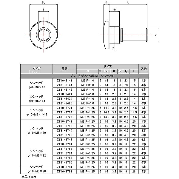 ジータ ZETA チタンブレーキディスクボルト01年-06年 GSX1400 フロント 片側分セット/純正と同形状、リア99年-07年 GSX1300R ハヤブサ フロント 片側分セット/ 純正と同形状、リア01年-04年 GSX-R1000 フロント 片側分セット、リア00年-05年 GSX-R750 フロント 片側分セット、リア04年-05年 GSX-R600 フロント 片側分セット、リアタイプ:シンヘッド φ10-M8X28入数:5本入り【サイズ】・d:M8 P=1.25・S:6mm・Dc:16mm・K:3.2mm・dS:10mm・Lg:9mm・L:28mm