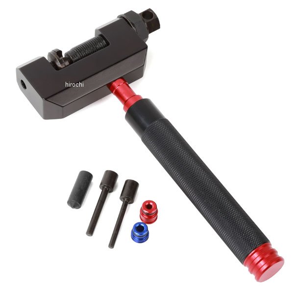 ディーアールシー DRC チェーンツール プロ カット/リベット 420-520サイズ:420/428/520/525/530まで対応取り扱い説明書はコチラチェーンのカット、プレートの圧入、かしめの3つの作業が可能。作業の流れを考慮したシンプルな部品構成で420/428/520/525/530サイズのチェーンまで対応。ボディは軽量なアルミを採用。ヘッドピンをボディ(ハンドル内)に収納できることにより、部品がばらつかず工具箱にすっきり収まる。