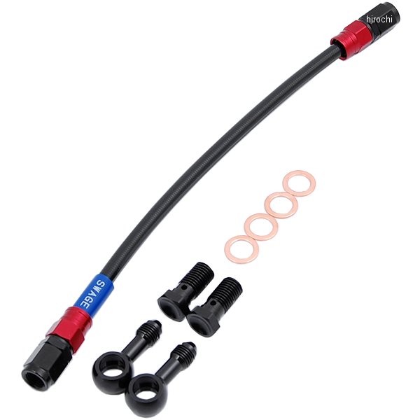 スウェッジライン SWAGE-LINE リア ブレーキホースキット03年-08年 KSR110・ブレーキホースは10mm単位の延長指定が出来ます。※延長分が合計で500mmを超える場合は500mmごとに1100円(税込)の追加料金がかかります。・ご注文時に「マスター側ホース+100mm、キャリパー側ホース+50mm」等を備考欄に記入してください。・バンジョーネジピッチ、アダプター角度は可能です。※カシメられたバンジョーを除く・アダプタータイプ、ボルトタイプ、数量、色の変更はできません。・キャンセル・交換・返品については、承れませんので予めご了承願います。ホース色:ブラックスモークコーティングホース素材:ステンレスメッシュバンジョー色:レッド/ブラックバンジョー素材:アルミフルード:無し取り廻し:ノーマルホース1:[ストレートバンジョー]+ストレートフィッティング-ストレートフィッティング+[ストレートバンジョー]/260[300]mmボルトピッチ:マスター側:1.25(シングル)、キャリパー側:1.25(シングル)【付属品】ホース(フィッティング付き)バンジョーアダプターバンジョーボルトクラッシュワッシャー汎用取扱説明書製品保証書
