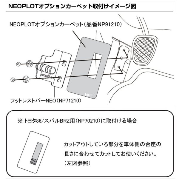 ネオプロト 4輪 オプションカーペット フットレストバーNEO NP71210用スバ インプレッサ(型式:GRB/GVB/GE#/GH#のMT車、GD#/GG#/GC#/GF#)スバ インプレッサG4(型式:GJ#)MT車)スバ インプレッサSPORT(型式:GP#)MT車)スバ フォレスター(型式:SJ#/SH#のMT車、SG#/SF#)スバ レガシィ(型式:BD#/BC#)スバ レガシィB4(型式:BM#/BL#のMT車、BE#)スバ レガシィツーリングワゴン(型式:BR#/BP#のMT車、BH#/BG#/BF#)スバ WRX STI(型式:VAB)サイズ:150mm(W)×200mm(H)、厚さ:2mm素材:ニードルパンチカーペット加工:無【仕様説明】フットレストバーNEOを装着した際にできる純正フロアカーペットとの隙間を隠すためのアイテムです。フットレストバーNEOの品番NP71210装着時に使用します。品番NP70210にも使用可能です。※本製品が無くてもフットレストバーNEOの装着は可能です。