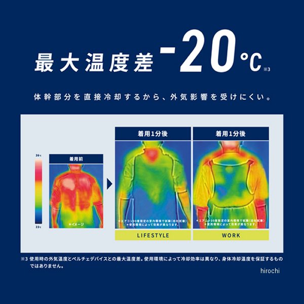 フリーズテック FREEZE TECH 充電式氷嚢ベスト L001サイズ:2XLカラー:ブラック素材:ポリエステル100%付属品:ペルチェベスト・ペルチェ冷感デバイス・USBコード・取扱説明書 兼 保証書温度調節:押しボタン式/4段階(間欠・強・中・弱)表示方法:電源・温度切替(LED4色表示)スイッチ、電源ON・温度調整時(間欠:白/強:赤/中:青/弱:緑)【対応バッテリー】充電式リチウムイオン or ポリマー電池(モバイルバッテリー)出力:5V/2.4A以上接続端子:USB仕様※モバイルバッテリー接続の際はペルチェデバイスの作動をご確認のうえご使用ください。【仕様説明】電気を流すと冷却プレートが冷え、反対面で排熱するペルチェデバイスの性質を活かし人体への冷却効果を発揮します。冷蔵庫と同じ冷却方式なので、電源ONですぐ冷えます。体幹部分を直接冷却するから、外気影響を受けにくいです。ストレッチ素材、ベルト調整可能で体にフィット。市販のモバイルバッテリーを電源として使用し、接続はベストから伸びるUSB端子コードをバッテリーに差し込むだけで簡単です。※バッテリーは付属しておりません。市販のモバイルバッテリー(出力:5V/2.4A以上、USB仕様)をお買い求めください。