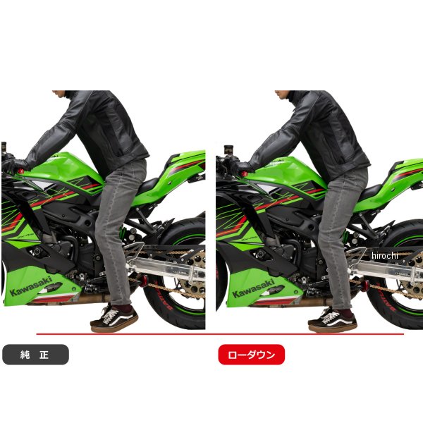 エフェックス EFFEX ローダウンキット シート高20mmダウン 調整機能無24年 カワサキ ZX-4RR24年 カワサキ ZX-4R SEタイプ:三角プレートタイプダウン量:-20mmカラー:ブラック素材:スチール仕様:リンクプレート交換仕上げ(表面処理):亜鉛メッキセット内容:ローダウンリンクプレート、EFFEXロゴステッカー、取扱説明書【仕様説明】ZX-4RR/ZX-4R SE用の、エフェックスのローダウンキット。20mmダウンのローダウン量で、足つきを改善。全世界で販売される事を考えられた純正の車高は我々日本人にとっては少し高い。つま先が付くか付かないかの状態では、「信号待ち」や「一時停止」といった発進や停車時は緊張を余儀なくされます。EFFEXのローダウンキットを使い、ほんの少し車高を下げる事で大きな安心感を得る事ができます。足つき性が上がり、重心が下がる事で車体にまたがったままの移動や、車体を手で押し引きする際にもその効果を実感していただけるはずです。また、エフェックスのローダウンキットは車種毎に運動性能を損なわない適切なダウン量を設定することで、乗ってもしっかり楽しいバランスを実現。あなたのバイクライフをもっと楽しく、より充実したものにしてくれます。※サイドスタンドは純正で対応可能です。※シート高はシート着座位置を通る垂直線上での測定値です。※数値は車両コンディションにより若干上下する場合があります。目安とお考えください。※適合車両、適合年式以外の車両へのご使用はお止め下さい。