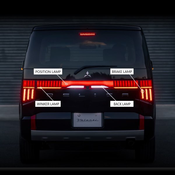 TMD5DLC-RG-1 ヴァレンティ VALENTI ジュエルLED テールランプ ULTRAライトスモークレンズ/ブラッククロームEマーク取得済み。保安基準適合製品です。三菱 デリカD:5 型式:CV1W 年式:2019.2~(H31.2~) 全グレード対応注意:OEA機能接続時、社外セキュリティ装着車は正常に動作しない可能性があります。OEA機能の動作には常時電源、イグニッション電源への接続が必要です。【商品説明】■オープニング&エンディングアクション機能搭載欧州車などのテールランプにも搭載されている機能で、ロック時またはアンロック時にテールランプがモーション点灯をします。注目度抜群の機能で周囲の視線を惹きつけます。※機能の動作には常時電源、イグニッション電源への接続が必要です。■内側テールランプから点灯するワイドなシーケンシャルウインカー(流れるウインカー)採用法改正により日本国内でも保安基準適合となった「シーケンシャルウインカー」を採用!内側テールランプから点灯することでよりワイド感のあるスタイリッシュな印象に。また、点灯面積を増やすことで後方からの視認性、安全性が向上。もちろん保安基準にも適合となり、テールランプ本体裏側の配線接続方法で「流れる」「流れない」の設定も簡単に変更可能。■選べるポジション点灯モードブレーキ点灯部分をポジション点灯できるブレーキポジションモードを搭載し、点灯パターンの選択ができます。※車両側ウェルカムライト機能と本製品のOEA機能を併用する場合は「ブレーキ部のポジション点灯パターン」は非点灯(白線ギボシを分離)状態にてご使用ください。保安基準不適合と判断される場合があります。■両側合計 326LED & 27LEDライトバーを採用!LEDライトバーによるポジションランプ点灯が幻想的なリアビューを演出し、後続車の目を釘付けにします。ポジション/ブレーキ、ウインカー、バックランプの全てに高輝度LEDを採用したオールLEDモデル。ブレーキ、ウインカーランプはインナーレンズを採用。バックランプは、インナーリフレクターに反射させ、直接LEDチップが見えない仕様としたことで消灯状態でもスタイリッシュな印象に。■ボディカラーやお好みに合わせて選べる、2色のカラーバリエーション・レッドレンズ/グロスブラック(TMD5DLC-RG-1)・ライトスモークレンズ/ブラッククローム(TMD5DLC-SB-1)