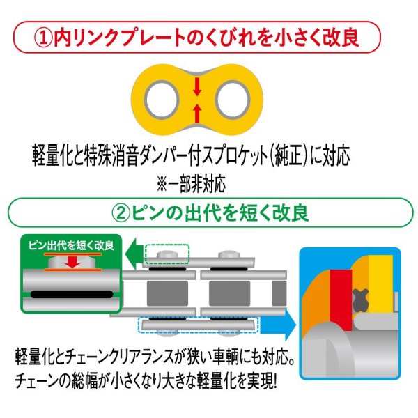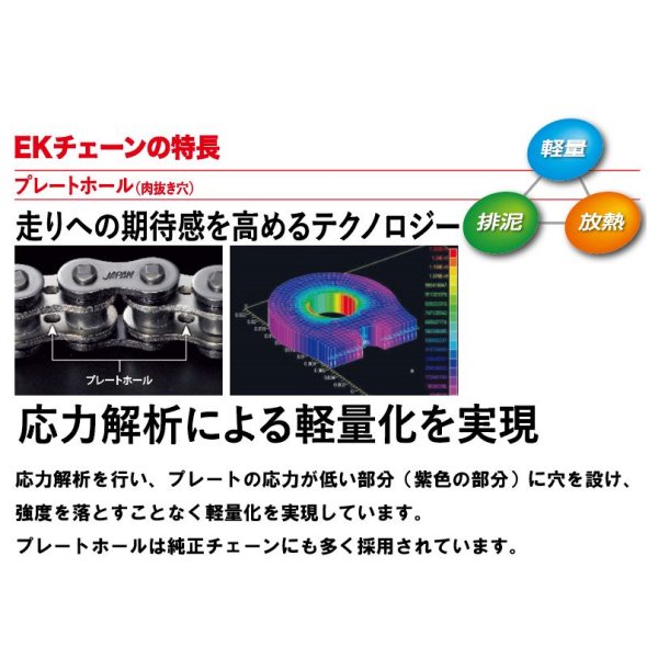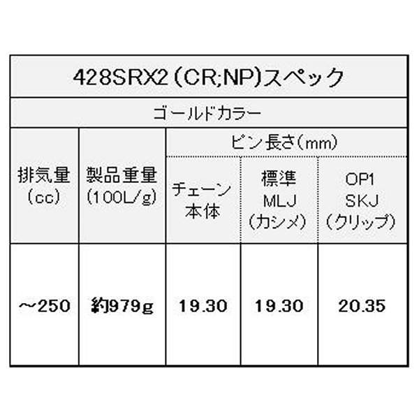 EKチェーン 428SR-X2シリーズ 132L シルバー MLJ カシメチェーンサイズ:428リンク数:132シールタイプ:QXリングジョイントタイプ:MLJ(カシメ)カラー:シルバー(CR;NP)SRXシリーズは、街乗りからロングツーリング等、幅広いシーンに使える卓越したバランス性能をもつ「ストリート用 シールチェーン」です。低フリクションで長寿命の「QXリング」を採用。チェーン内プレートには、EK独自の「穴あきプレート」技術を採用し軽量化されています。必要なリンク数で購入できます。