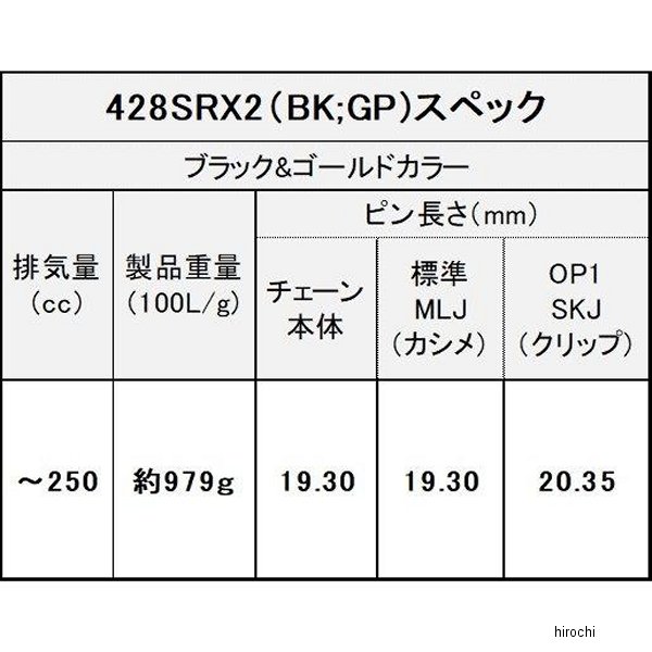 EKチェーン 江沼チェーン 428SR-X2 シリーズ 80L カシメジョイント ブラック/ゴールドチェーンサイズ:428リンク数:124ジョイントタイプ:MLJ(カシメジョイント)シールタイプ:QXリングカラー:ブラック/ゴールド(BK/GP)【仕様説明】SRXシリーズは、街乗りからロングツーリング等、幅広いシーンに使える卓越したバランス性能をもつ「ストリート用 シールチェーン」です。低フリクションで長寿命の「QXリング」を採用。チェーン内プレートには、EK独自の「穴あきプレート」技術を採用し軽量化されています。必要なリンク数で購入でき「~250まで」の小排気量車種に最適な商品です。※カシメジョイントMLJ 同梱/取付けには専用工具が必要です。 製品の取扱について下記を必ずご一読の上、購入、使用ください。※注意事項※安全にご使用いただくために【品質保証】◎保証範囲当社製品に不具合が発生し、当社がこれを確認した場合は、速やかに当社製品を無償で納入させて頂きます。ただし、以下の費用は保証範囲外とさせて頂きます。(1)お客様の車両から当社製品を交換・修理の為に取り外す取付けるために要する費用及びこれらに付帯する費用(スプロケット、ハブダンパーなど)(2)お客様の車両を修理店へ輸送するために要する費用(3)不具合や修理に伴うお客様の逸失利益ならびにその他の拡大損害費用◎無償保証期間工場出荷後1年間を当社の無償による保証期間と致します。(商品パッケージ内に出荷日付印が御座います)ただし下記、重要事項・注意事項を遵守されていない使用の場合、保証対象外とさせて頂きます。※保証をご希望される場合、商品購入先へのご連絡をお願いします。直接は受付できません。【重要】・チェーンへの追加工をした場合。・整備資格又は同等の知識と経験のない方がご自分で取付けをした場合。(チェーン取付は、オートバイ専門店に依頼してください。)・チェーン取付に、専用の工具を用いず正しい方法で取付けしなかった場合。(チェーンをカットする際、サンダー、たがね等は使用しないでください)・チェーンサイズの変更(コンバート)、適応排気量範囲外での使用をした場合。チェーンの使用可能排気量内でコンバートしたとしても、純正サイズからサイズダウンのコンバートは従来のサイズより寿命が下がります。(チェーンの適合は、弊社車種適合表で確認し選定ください。)・ジョイント(継手)をチェーンと同じサイズ、グレードでない物を使用した場合。・酸・強アルカリ・パッテリー液などがチェーンに付着した場合。(直ちに使用を中止し新品に交換してください。)・チェーンのたるみ量(たわみ量)が適正で使用されなかった場合。(車両のサービスマニュアルに記載されている数値にて調整ください。)・チェーンメンテナンスを定期的に行っていない場合。500毎及び雨天・悪路走行後、必ず洗浄給油にはEKチェーンクリーナー、EKチェーンルブを使用してください。パーツクリーナー特にシールチェーンでは灯油、ガソリンなど揮発性溶剤は決して使用しないでください。(チェーン&パーツクリーナー等の商品もシールを傷めます)・融雪剤等の塩化物質がチェーン付着した場合。・日本のみでの使用とし海外への持ち出し、使用した場合。【注意】・上記によるチェーンに発生した錆、キズ、スプロケットの芯ずれ等のねじれがある場合。(直ちにチェーンを新品に交換してください)・走行中に異音、車体との干渉がある状態で使用した場合。(原因を解決した上で新品のチェーンに交換してください)・チェーンを交換する際にフロントスプロケット、リアスプロケット、ハブダンパー等の関連する部品も同時に新品へ交換せずに使用した場合。・スプロケットを純正歯数から極端に歯数を増減した物へ変更して使用した場合。(チェーンの寿命が短くなる可能性があります)