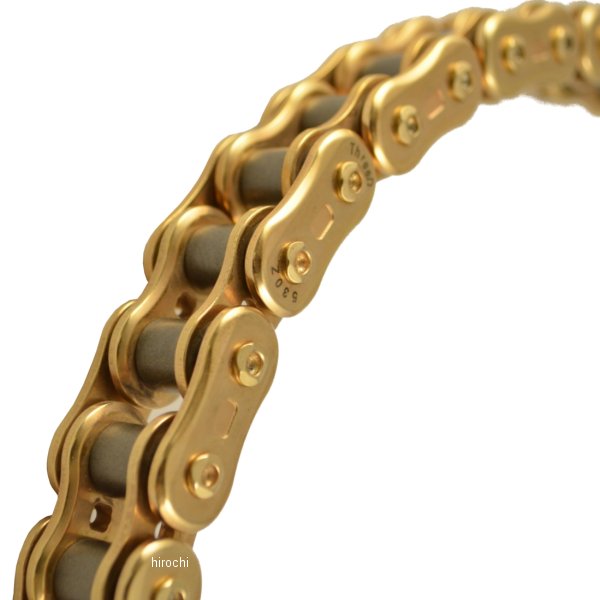 EKチェーン 江沼チェーン チェーン スリード Threed 530Z シリーズチェーンサイズ:530リンク数:100シールタイプ:QX2リングジョイントタイプ:MLJ(カシメ)カラー:ゴールド(GP;GP)【ThreeD(スリード Threed )チェーンコンセプト】ThreeD(スリード Threed )とは、Design(デザイン)・3Dimension(立体的)・Dynamic(力強い、動的)の3つの「D」の意味。印象的:究極のプレート形状。美と機能を追求した曲線フォルムはまさに次世代チェーンの進化型。動的:脅威の伝達効率。卓越した動力性能により強力で伸びやかな加速を実現。プレートへの精密鍛造加工による剛性力の向上。外内プレートに面取りが施され、軽量化+スプロケットとの噛み合い性が向上。優雅:3Dデザインによる、流麗なボディランと艶やかで朽ちることなき光の反射。先進:従来とは異なる画期的な工法を開発・実用化。耐久性・品質精度などすべてにおいて標準値をはるかに凌ぎ、初期伸びゼロを目指した高精度チェーン。軽量:限界を極限まで高め、ムダを省いたスリム設計。重量を上げずに強度を上げる独自の技術を結集。ピン両端へ穴あけ、内プレートへの穴あけを施す事による軽量化を実現。低フリクションかつ耐摩耗性に優れたQXリングに更なる改良で開発された「QX2リング」。QXリングに比べ30%の耐摩耗性の向上を実現しました。カワサキ Ninja H2Rに純正採用。誰も体感したことのない加速力はThreeDチェーンと共にあります。ThreeDチェーンで引き出される愛車の更なるハイパワーを体感してください。