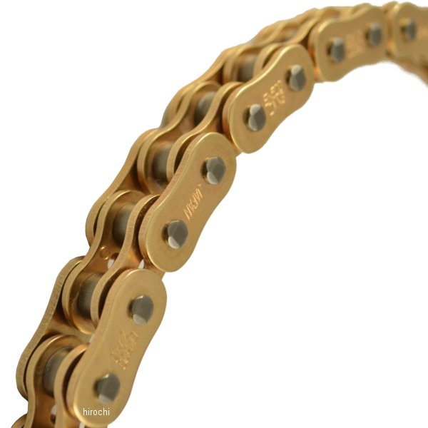 EK 江沼 チェーン 520ZVX3 シリーズチェーンサイズ:520リンク数:122シールタイプ:NXリングジョイントタイプ:MLJ(カシメ)カラー:ゴールド(GP;GP)ZVX:最高級、高強度、高耐久性、軽量化NXリングチェーン。大排気量、ハイパワーマシンに対応させた高強度、高耐久性、軽量化を実現させたNXシールチェーン。EK独自のNXリングはQXリングに比べ高耐久性、軽量化を実現させています。また、シールの形状変更によりチェーンの高強度化を実現させています。・従来のZVXシリーズより引張り強度に対する剛性が向上・長寿命を保証するソリッドブッシュ。・高耐久ソリッドローラ。・四方かしめピン。・特殊合金プレート。・軽量化のための内プレート穴採用。・特殊PTFEグリースは粘着力に優れ、耐摩耗性向上に貢献。