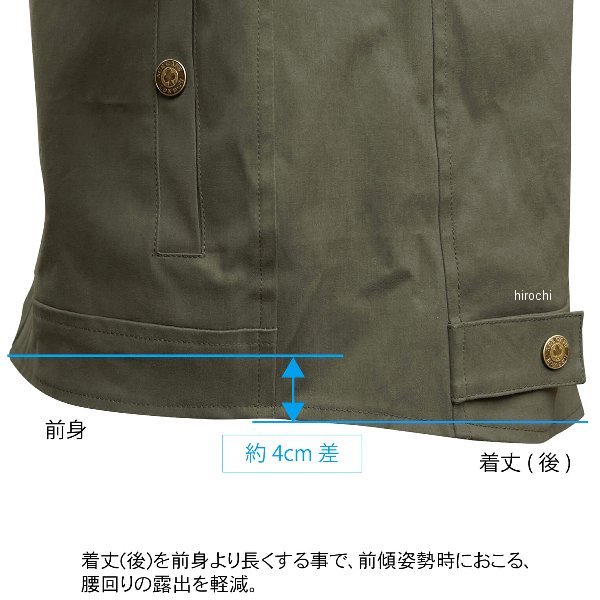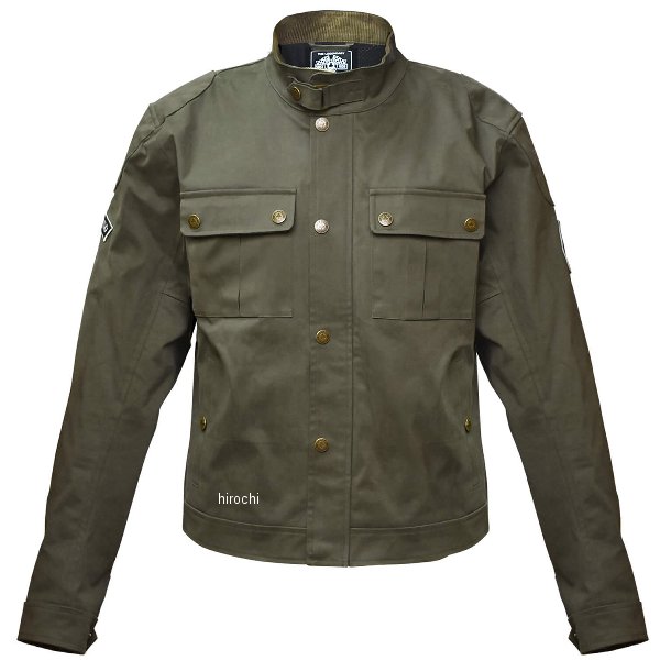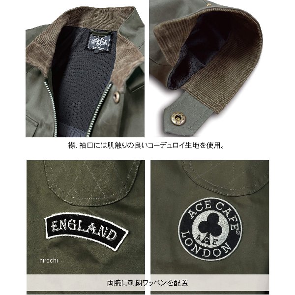 エースカフェロンドン ACE CAFE LONDON 秋冬モデル ヒストリックコットンブルゾンサイズ:Mカラー:モスグリーン標準装備プロテクター(着脱式ソフト):肩、肘、背中【素材】表生地:コットン(起毛加工)+防風フィルム裏生地:ナイロンメッシュ【仕様説明】ヴィンテージなライディングブルゾンを復刻。両腕のワッペンや、肩の当て布など、細部にまでこだわりが詰まっています。表地に起毛加工を施したコットンを使用し、体が冷やされる一番の要因である寒風の侵入を防ぐために、防風フィルムを貼り合せ、ブルゾンスタイルに仕上げました。近年の温暖な気候に合わせ、あえて中綿を使用していません。気候に合わせたインナーとの組み合わせにより、秋/冬/春の3シーズン着用いただけます。【機能/マテリアル】生地自体に防風フィルムを貼り合わせる製法を採用する事で、生地が持つ質感や柔らかい着心地を残しながら風の侵入をカット。襟、袖口には肌触りの良いコーデュロイ生地を使用。着丈(後)を前身より長くする事で、前傾姿勢時におこる、腰回りの露出を軽減。腰の左右にアジャストベルトを配置。フロント最下段のボタンを隠しボタンにすることで、乗車時のタンクとの接触を軽減。両腕に刺繍ワッペン、肩にはクラシカルなパデッド処理を施した当てを配置。各ボタンにオリジナルロゴのブラス調ラージサイズボタンを使用。【プロテクション】新型胸部プロテクターポケットを採用しプロテクター位置の微調整が可能。POi DESIGNS製の胸部プロテクター全タイプの装着が可能(別売り)OPC-01(硬質プロテクター)、OPC-01-PRO/OPC-02-PRO(CEプロテクター)、CPL-001S(女性用プロテクター)※胸部プロテクターを装着しづらい場合、胸部プロテクターポケットを本体から外し、プロテクターを装着してから本体へ戻してください。肩、肘、背中には着脱式ソフトプロテクターを標準装備。より高度なプロテクションとして、POi DESIGNS製プロテクターを肩、肘、背中にそれぞれ換装可能。肩:PN-004(CEプロテクター) / 肘:PN-003(CEプロテクター) / 背中:OPB-01(硬質プロテクター)