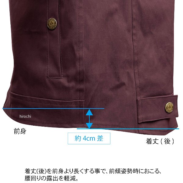 エースカフェロンドン ACE CAFE LONDON 秋冬モデル ヒストリックコットンブルゾンサイズ:Lカラー:バーガンディ標準装備プロテクター(着脱式ソフト):肩、肘、背中【素材】表生地:コットン(起毛加工)+防風フィルム裏生地:ナイロンメッシュ【仕様説明】ヴィンテージなライディングブルゾンを復刻。両腕のワッペンや、肩の当て布など、細部にまでこだわりが詰まっています。表地に起毛加工を施したコットンを使用し、体が冷やされる一番の要因である寒風の侵入を防ぐために、防風フィルムを貼り合せ、ブルゾンスタイルに仕上げました。近年の温暖な気候に合わせ、あえて中綿を使用していません。気候に合わせたインナーとの組み合わせにより、秋/冬/春の3シーズン着用いただけます。【機能/マテリアル】生地自体に防風フィルムを貼り合わせる製法を採用する事で、生地が持つ質感や柔らかい着心地を残しながら風の侵入をカット。襟、袖口には肌触りの良いコーデュロイ生地を使用。着丈(後)を前身より長くする事で、前傾姿勢時におこる、腰回りの露出を軽減。腰の左右にアジャストベルトを配置。フロント最下段のボタンを隠しボタンにすることで、乗車時のタンクとの接触を軽減。両腕に刺繍ワッペン、肩にはクラシカルなパデッド処理を施した当てを配置。各ボタンにオリジナルロゴのブラス調ラージサイズボタンを使用。【プロテクション】新型胸部プロテクターポケットを採用しプロテクター位置の微調整が可能。POi DESIGNS製の胸部プロテクター全タイプの装着が可能(別売り)OPC-01(硬質プロテクター)、OPC-01-PRO/OPC-02-PRO(CEプロテクター)、CPL-001S(女性用プロテクター)※胸部プロテクターを装着しづらい場合、胸部プロテクターポケットを本体から外し、プロテクターを装着してから本体へ戻してください。肩、肘、背中には着脱式ソフトプロテクターを標準装備。より高度なプロテクションとして、POi DESIGNS製プロテクターを肩、肘、背中にそれぞれ換装可能。肩:PN-004(CEプロテクター) / 肘:PN-003(CEプロテクター) / 背中:OPB-01(硬質プロテクター)