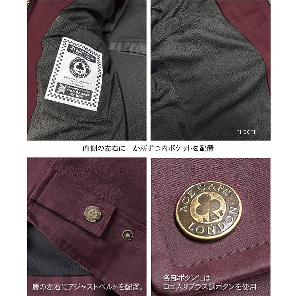 エースカフェロンドン ACE CAFE LONDON 秋冬モデル ヒストリックコットンブルゾンサイズ:XXLカラー:バーガンディ標準装備プロテクター(着脱式ソフト):肩、肘、背中【素材】表生地:コットン(起毛加工)+防風フィルム裏生地:ナイロンメッシュ【仕様説明】ヴィンテージなライディングブルゾンを復刻。両腕のワッペンや、肩の当て布など、細部にまでこだわりが詰まっています。表地に起毛加工を施したコットンを使用し、体が冷やされる一番の要因である寒風の侵入を防ぐために、防風フィルムを貼り合せ、ブルゾンスタイルに仕上げました。近年の温暖な気候に合わせ、あえて中綿を使用していません。気候に合わせたインナーとの組み合わせにより、秋/冬/春の3シーズン着用いただけます。【機能/マテリアル】生地自体に防風フィルムを貼り合わせる製法を採用する事で、生地が持つ質感や柔らかい着心地を残しながら風の侵入をカット。襟、袖口には肌触りの良いコーデュロイ生地を使用。着丈(後)を前身より長くする事で、前傾姿勢時におこる、腰回りの露出を軽減。腰の左右にアジャストベルトを配置。フロント最下段のボタンを隠しボタンにすることで、乗車時のタンクとの接触を軽減。両腕に刺繍ワッペン、肩にはクラシカルなパデッド処理を施した当てを配置。各ボタンにオリジナルロゴのブラス調ラージサイズボタンを使用。【プロテクション】新型胸部プロテクターポケットを採用しプロテクター位置の微調整が可能。POi DESIGNS製の胸部プロテクター全タイプの装着が可能(別売り)OPC-01(硬質プロテクター)、OPC-01-PRO/OPC-02-PRO(CEプロテクター)、CPL-001S(女性用プロテクター)※胸部プロテクターを装着しづらい場合、胸部プロテクターポケットを本体から外し、プロテクターを装着してから本体へ戻してください。肩、肘、背中には着脱式ソフトプロテクターを標準装備。より高度なプロテクションとして、POi DESIGNS製プロテクターを肩、肘、背中にそれぞれ換装可能。肩:PN-004(CEプロテクター) / 肘:PN-003(CEプロテクター) / 背中:OPB-01(硬質プロテクター)