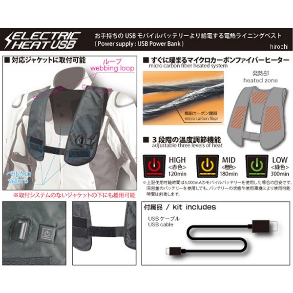 コミネ KOMINE 秋冬モデル エレクトリックライニングベストUSBサイズ:フリーカラー:ブラック【素材】ポリエステル100%【仕様説明】コミネ製対応ジャケットにオプション装着できる電熱ライニングベスト。microUSB端子を備え、市販のモバイルバッテリーを使用可能。前側にベルクロ付きゴムバンドを備えているので、他社製ジャケットの下に着込むことも可能。バッテリー接続用USBケーブルを付属。※電熱機能を使用するには、2.0A以上のUSB出力を備えた市販の充電式モバイルバッテリーを別途ご用意ください。※モバイルバッテリーは付属しません。【機能】すぐに温まるマイクロカーボンファイバーヒーター。運動性を高める立体裁断。3段階の温度調節機能。USBケーブル付属。使用可能シーズン:春、秋、冬