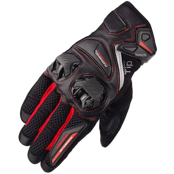 コミネ KOMINE 春夏モデル プロテクトレザーメッシュグローブサイズ:3XLブラック/レッド標準装備プロテクター:拳、掌、指、手首【素材】山羊革、ポリエステル、ナイロン【仕様説明】エアインテーク付きナックルガードを採用したレザー&メッシュのグローブです。走行時、最も風が当たる指部分には通気性の良いメッシュを大きく使用し、万が一の時にダメージを受けやすい甲から手首にかけてはレザーを使用しました。スマートフォン操作も可能です。使用可能シーズン:春、夏、秋【機能】・通気性のよいメッシュ素材・運動性を高める立体裁断・夜間被視認性を高めるリフレクター装備・吸気付きの新しいタイプのプラスチック製ナックルプロテクター・カーボンパームスライダー・TPRベルクロカフタブ・指先に導電性レザー・アンチコピー4Dラベル