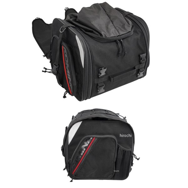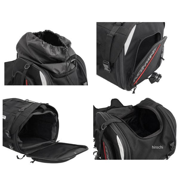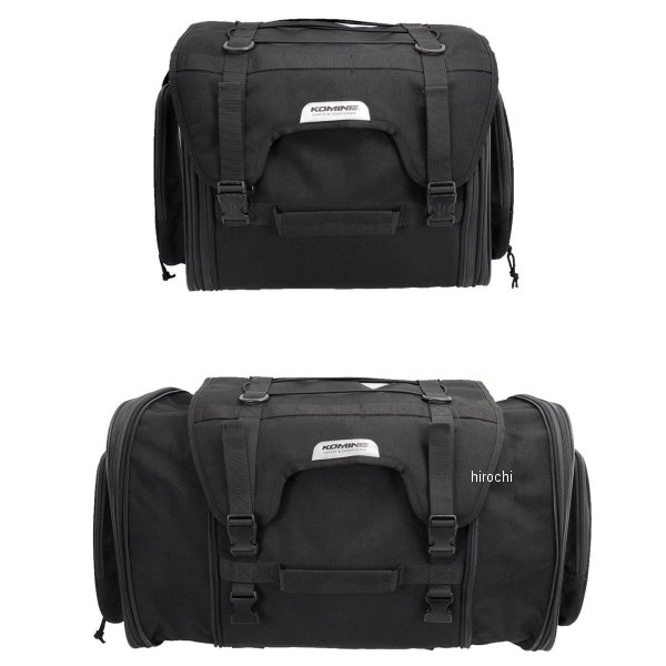 コミネ KOMINE ジャーニーシートバッグ容量:38L-58Lカラー:ブラック【素材】1,000Dポリエステル、200Dポリエステル【仕様説明】積載性を重視した、一泊から一週間程度のツーリングに対応する大容量のシートバッグです。シンプルなドラム形状のバッグ本体には型崩れを防ぐワイヤーフレームと樹脂製フレームを内蔵。両サイドの拡張ジッパーにより、58Lまで拡張可能です。【機能】・夜間被視認性を高めるリフレクター装備・偽造防止4Dラベル