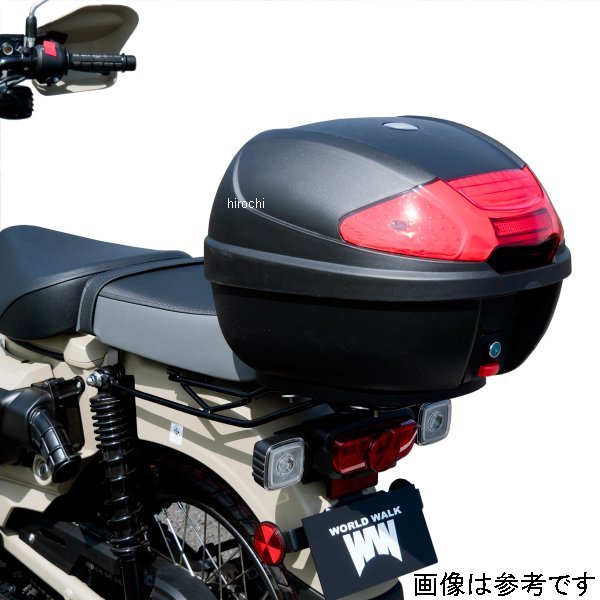 ワールドウォーク タンデムシート&キャリアボックスセット 48Lホンダ CT125ハンターカブ(2BJ-JA55)ホンダ CT125ハンターカブ(8BJ-JA65)【素材】取り付け金具:スチール付属ボルト:ステンレス付属カラー:アルミ【仕様説明】現行の国内車両のシートにそのまま取り付けが可能なハンターカブ専用のタンデムシートキットが登場。リアキャリアとの併設が可能。タンデム時も充分な積載が可能となっているので、ツーリング時やキャンプツーリング等でも安心です。金具さえ取り付けてしまえば、あとはワンタッチで着脱が可能です。固定式ではないので、用途に合わせて取り外す際も簡単です。シート固定フックを取り付け金具に引っ掛けた後は、片手でポンと押すだけで取り付け完了!取り外しもシートを下から押し上げるだけなので、女性の力でも簡単に着脱ができるのも魅力。純正キャリアにシートを載せたタンデムスタイルの場合、がに股での乗車スタイルになりがちですが、こちらのタンデムシートであればスッキリ縦長の形状で、タンデム時の乗り心地も抜群。長時間のツーリング時でも負担が軽減される筈です。