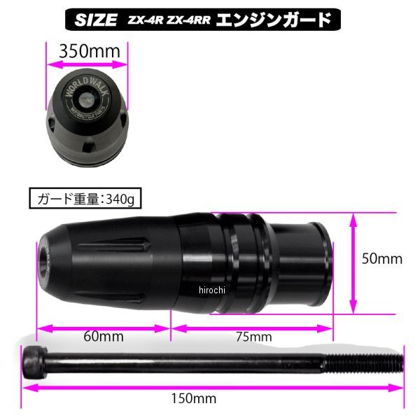 ワールドウォーク エンジンガード 左側24年 カワサキ ニンジャ ZX-4RR24年 カワサキ ニンジャ ZX-4R SE型式:8BL-ZX400P素材:本体/アルミ、スライダー/ジュラコン、ボルト/スチール【仕様説明】ZX-4R/ZX-4RR専用のエンジンガードです。車体からしっかりとガードが張り出す形となっており、立ちゴケや転倒時などに車体のダメージを軽減してくれます。ブラックアルマイト仕上げの為、車体に取り付けても悪目立ちしません。・エンジンへのダメージ軽減クランクケース割れなどエンジンへの致命的なダメージを防ぐと共にカウルやタンクなどのダメージも軽減します。エンジンマウント部分に装着しますが、ホームセンターなどでも販売されているボルトを純正で採用しておりますので、折れや曲がりなどの補修も簡単です。・つや消しアルマイト仕上げで目立たない本体は軽量でありながら、剛性のあるアルミ削りだしで制作しました。 更に、耐摩耗性を向上し見た目も美しいアルマイト処理済みです。 ジュラコン部分も同じく黒で仕上げているので悪目立ちせず、車体との一体感があります。・シンプルなお取り付け方法純正ボルトを付属のボルトに差し替えて装着するだけなので装着は比較的簡単です。・軽量ながら変形しにくい材質に1本(片側)で340gと軽量設計に。軽量ながら立ちゴケやスリップダウンからの車体保護を想定した形状に仕上げました。・WWのロゴ刻印ワールドウォークオリジナルのロゴデザインを採用しました。主張しすぎない位置に刻印しております。※転倒の仕方によっては未装着時と比べてダメージが大きくなる事もございます。※製品は予告なく仕様変更をする場合もございます。誠に恐れ入りますが予めご了承ください。※ご自身でお取り付けを行った場合は如何なる場合も補償の対象外となります。恐れ入りますがご理解いただけますと幸いです。