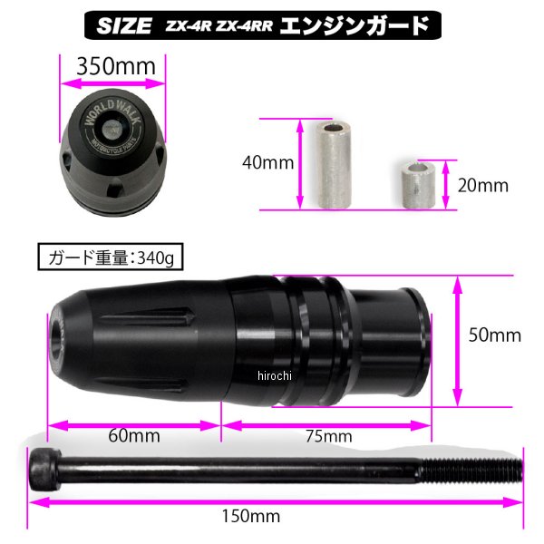 ワールドウォーク エンジンガード 左右セット24年 カワサキ ニンジャ ZX-4RR24年 カワサキ ニンジャ ZX-4R SE型式:8BL-ZX400P重量:340g素材:本体/アルミ、スライダー/ジュラコン、ボルト/スチール付属品:エンジンガード本体、取り付けボルト×2本【仕様説明】ZX-4R/ZX-4RR専用のエンジンガードです。車体からしっかりとガードが張り出す形となっており、立ちゴケや転倒時などに車体のダメージを軽減してくれます。ブラックアルマイト仕上げの為、車体に取り付けても悪目立ちしません。・エンジンへのダメージ軽減クランクケース割れなどエンジンへの致命的なダメージを防ぐと共にカウルやタンクなどのダメージも軽減します。エンジンマウント部分に装着しますが、ホームセンターなどでも販売されているボルトを純正で採用しておりますので、折れや曲がりなどの補修も簡単です。・つや消しアルマイト仕上げで目立たない本体は軽量でありながら、剛性のあるアルミ削りだしで制作しました。 更に、耐摩耗性を向上し見た目も美しいアルマイト処理済みです。 ジュラコン部分も同じく黒で仕上げているので悪目立ちせず、車体との一体感があります。・シンプルなお取り付け方法純正ボルトを付属のボルトに差し替えて装着するだけなので装着は比較的簡単です。・軽量ながら変形しにくい材質に1本(片側)で340gと軽量設計に。軽量ながら立ちゴケやスリップダウンからの車体保護を想定した形状に仕上げました。・WWのロゴ刻印ワールドウォークオリジナルのロゴデザインを採用しました。主張しすぎない位置に刻印しております。・エンジンガードは1セットで両側分付属1セットで両側2本分のセットとなっております。※転倒の仕方によっては未装着時と比べてダメージが大きくなる事もございます。※製品は予告なく仕様変更をする場合もございます。誠に恐れ入りますが予めご了承ください。※ご自身でお取り付けを行った場合は如何なる場合も補償の対象外となります。恐れ入りますがご理解いただけますと幸いです。