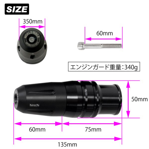 ワールドウォーク エンジンガード23年 スズキ Vストローム250(8BK-DS12E)重量:340g材質:[本体]アルミ・[スライダー]ジュラコン・[ボルト]ステンレス付属品:エンジンガード本体・取り付けボルト×2本【エンジンへのダメージ軽減】クランクケース割れなどエンジンへの致命的なダメージを防ぐと共にカウルやタンクなどのダメージも軽減します。エンジンマウント部分に装着しますが、ホームセンターなどでも販売されているボルトを純正で採用しておりますので、折れや曲がりなどの補修も簡単です。【つや消しアルマイト仕上げで目立たない】本体は軽量でありながら、剛性のあるアルミ削りだしで制作しました。更に、耐摩耗性を向上し見た目も美しいアルマイト処理済みです。ジュラコン部分も同じく黒で仕上げているので悪目立ちせず、車体との一体感があります。【シンプルなお取り付け方法】純正ボルトを付属のボルトに差し替えて装着するだけなので装着は比較的簡単です。※ご自身でお取り付けを行った場合は補償の対象外となります。【軽量ながら変形しにくい材質に】1本(片側で)340gと軽量設計に。軽量ながら立ちゴケやスリップダウンからの車体保護を想定した形状に仕上げました。【WWのロゴ刻印】ワールドウォークオリジナルのロゴデザインを採用しました。主張しすぎない位置に刻印しております。【1セットで両側分付属】1セットで両側2本分のセットとなっております。【注意事項】※転倒の仕方によっては未装着時と比べてダメージが大きくなる事もございます。※製品は予告なく仕様変更をする場合もございます。誠に恐れ入りますが予めご了承ください。※ご自身でお取り付けを行った場合は如何なる場合も補償の対象外となります。恐れ入りますがご理解いただけますと幸いです。
