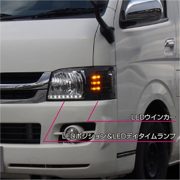 ヴァレンティ VALENTI ジュエルヘッドランプH16.8-H22.6 トヨタ 200系ハイエース/レジアスエース(1~2型)全グレード対応レンズカラー:クリアインナーカラー:マットブラックロービーム&ハイビーム:H4ポジション&デイタイムランプ:LED(8LED)※デイタイムランプはポジションランプと兼用となります。ポジションランプスイッチONで減光し、ポジションランプとなります。ウインカー:LED(14LED[前方6LED+側方8LED])光軸レベライザー:純正レベライザーを移植付属品:ヘッドランプ本体、ユーロウインカーリレーEマーク取得済み。保安基準適合製品ヴァレンティ ジュエルヘッドランプシリーズに1型、2型モデル専用タイプが復刻。インナーマットブラック仕様のモデルでウインカー部分をLED化し、さらにLEDポジション&デイタイムランプを装備したオリジナルモデルです。ポジション&デイタイムランプには片側8LED、ウインカーには片側14LEDを配して存在感をアピール。愛車のイメージチェンジやリフレッシュなどに大変おすすめです。※バルブは付属していません。※リフレクター部の焼けを避けるため、HIDキットは使用しないでください。