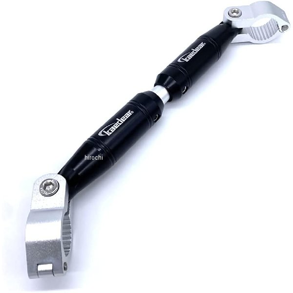 KDR-HB1SK カエディア Kaedear アジャストブレース シルバー/ブラック【調整式】本来の剛性を高める上では六角イモネジでの調整機構は望ましくありません。しかしニーズはドレスアップ要素とマウントパーツのクランプバーとして高まる中で、ねじ式は伸ばすとねじ山が見えてしまいルックスに問題があります。そこでKaedearアジャストブレースではイモネジ式を採用し、伸ばしてもスタイルが変わらない仕様としました。またクランプバー部分は削り出しの角度が傾斜であるほどかっこよく見える一方で、マウントできる面積が減ってしまいます。その双方をバランスよく設計し、ビジュアルとマウント面積を最大限に確保したハンドルブレースとなりました。【美しい艶とクールな艶無し】 CNCならではのアルミ感を強調する為、太いバーを艶あり、ハンドル固定部とアジャストの軸を艶無しで仕上げました。発色に差を作ることで締まりがあり、より美しさが強調されます。■サイズ:取り付け径22mm、バー径22mm/12.7mm、調整範囲330mm~225mm■重量200g■材質:アルミニウム合金■内容:ハンドルブレース一式 ※ハンドル径22.0-22.2mm標準ハンドル専用です。28.6-22.0mmテーパーハンドルのテーパー部分や標準ハンドルでもカーブしている部分へのお取り付けは、内径の削り加工やワッシャーでクランプを調整する必要がある場合があります。