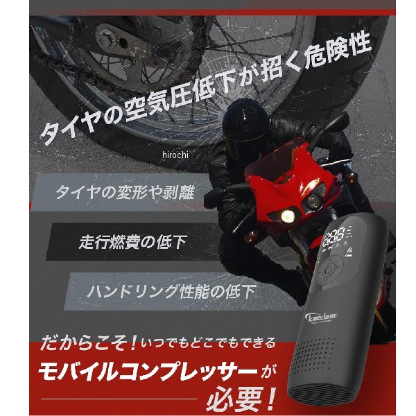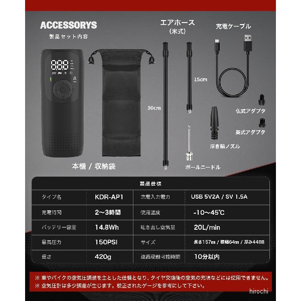 カエディア Kaedear モバイルコンプレッサー空気圧調整が自宅やツーリング先で手軽に行える充電式電動エアーポンプ。車のタイヤの空気圧調整や自転車の空気入れとしてもご使用頂けます。物理ボタンは作業中にグローブをしたまま空気圧調整が可能。指定した空気圧まで自動的に充填します。電池容量:デュアルバッテリー2000mAh/3.7V 合計4000mAh/14.8wha吐出量:150PSI(20L/min)充電:5V2A/タイプC空気圧単位:PSI、BAR、KPA、Kg/cm2空気圧上限:999KPAた空気圧まで自動的に充填します。【商品内容】モバイルコンプレッサー、エアーホース(米式バルブ)、仏式バルブアダプター、英式バルブアダプター、ボールニードル、浮き輪ノズル、充電ケーブル、収納袋、商品マニュアル【商品詳細】サイズ:長さ157mm、横幅64mm、厚み44mm、重さ:420g使用温度:-10~45度連続稼働時間:10分以内