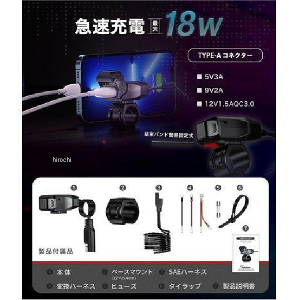 カエディア Kaedear MOTO USBチャージャー AC【防水 キャップと電源スイッチ】雨の日の走行や屋外駐輪でも安心な密封性の高い 防水 構造。蓋内部の突起の外周にOリングを組み込み、高い密封性を確保しました。また防水キャップはスイッチに連動しており、蓋を閉めた状態では電源OFF、蓋を開けた状態では電源ON、アクセサリーでの接続では消費電力の削減になり、バッテリー直でしか配線ができないユーザーにも導入しやすい仕様です。【マウント方法と電源接続】タイラップを通して縛り付けるだけの超簡易固定方式を採用。設置が簡単になり、コストダウンに繋がりました。電源12VはカエディアQIスマホホルダーと同一仕様、SAEハーネスはギボシからクワガタ、平型分岐に変換可能。外したいときは車両に配線を残したままSAEコネクターを抜くだけで取り外し可能。【商品仕様】本体サイズ:縦52mm、横28mm、厚さ22mm入力電圧:12Vバッテリー車(6V-30V)出力電力:【タイプA】5V3A/9V2A/12V1.5A(18W)【タイプC】5V3A/9V3A/12V3A(36W)プロテクション保護:⑴ヒートプロテクション⑵過電圧プロテクション⑶過電流プロテクション⑷ショートサーキットプロテクション規格:IP67、CE、FCC、ROHS素材:ポリカーボネート本体重量:30gセット内容:【KDR-M3A】USB本体(タイプA)、ベースマウント(22/25.4mm)、タイラップ、SAEハーネス、変換ハーネス、ヒューズ【KDR-M3C】USB本体(タイプC)、ベースマウント(22/25.4mm)、タイラップ、SAEハーネス、変換ハーネス、ヒューズ【KDR-M3AA】USB本体(タイプA)、USB本体(タイプA)、ベースマウント(22/25.4mm)×2、タイラップ×4、SAEハーネス(Y字2コネクター)、変換ハーネス、ヒューズ、取り扱い説明書【KDR-M3AC】USB本体(タイプA)、USB本体(タイプC)、ベースマウント(22/25.4mm)×2、タイラップ×4、SAEハーネス(Y字2コネクター)、変換ハーネス、ヒューズ、取り扱い説明書