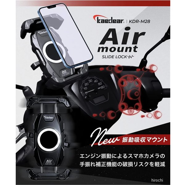 カエディア Kaedear スライドロック エアマウント搭載 スマホホルダーカラー:ブラック【対応参考機種】iPhone 14 ProMax、iPhone14 Pro、iPhone14iPhone13 ProMax、iPhone13 Pro、iPhone13iPhone12 ProMax、iPhone12 Pro、iPhone12iPhone11 ProMax、iPhone11 Pro、iPhone11iPhone XS Max、iPhone XR、iPhone X、iPhone8 PlusiPhone7 PlusSAMSUNG Galaxy S9、S9 Plus、Note 8、S8、S8 PlusSony、Huawei、Google Pixel など5.4-7.2インチ※対応スマホサイズ縦幅:130~190mm横幅:65~85mm厚さ:17mm主な素材:アルミ合金(本体マウント部)ステンレス(アーム部)強化プラスチックポリアラミド PA66GF 他新たな振動吸収システム「Air マウント」を搭載したベーシックが登場。コスパの高い新製品。・ボディ一体型 Air マウント【振動吸収機能】搭載ボディ一体型の振動吸収機構搭載。ホルダー裏側に 4 個配されたエアキャップがホルダー全体をフロートさせ、全ての方向に対する振動を吸収。エアサスのような劇的効果を発揮します。カメラ機能に悪影響があると言われる高周波振動を抑え、ホルダー自体の姿勢安定性も向上しています。・素早い脱着と耐久性が向上したスライドロック上下アームは稼働量が同じです。例えば、上アームを引き上げると同じ長さだけ下アームが下がります。素早い脱着が可能です。上下アームの動きを効率的に連動、スマホ脱着時の負担を抑え、耐久性が格段に向上。金属はステンレスを多様し錆にも対応。・固定解除はサイドレバーでワンタッチスマホを取り付ける時は、スマホをアームに挟んだら右のレバーを下げる、外す時は左のレバーを下げてアームを押し上げ。どちらもストレスなく脱着できます。高い汎用性、充電ケーブル対応、スマホカメラが干渉しずらいボディ形状商品は予告なく仕様変更する場合があります。予めご了承ください。