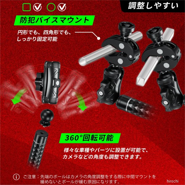 カエディア Kaedear GOPRO&INSTA 360度マウントキット素材:アルミニウム合金サイズ:寸法A36cm、寸法B35.3cm、寸法C38.5cm、寸法D110cm(伸ばした状態)、寸法E42.5cm(縮めた状態)径:上段16mm、中段20mm、下段24.8mm重量:918.3g【仕様説明】先端が1/4インチカメラネジとなっており、カメラやマイクなど様々な使い方に対応。付属の変換マウントでGOPROやDJI CAMERAなどのタイプもご使用頂けます。バイクと本体を繋ぐクランプは四点でクランプする構造となっており、12.7mm~50.8mmまで対応し、円柱以外に四角柱や三角柱でも固定できます。また、防犯仕様となっており専用の防犯ネジが無いと取り外しができない盗難防止設計となっております。カメラマウントの長さはロックリングを回すことによりお好みの長さに調整が可能、また1インチボールマウントにより360°回転が可能であり、様々な車種、多彩なアングルでの撮影が可能。カメラマウントを後部に設置することにより、手軽に三人称視点での撮影が可能。※公道でご使用する際は、必ず道路交通法を遵守してください。