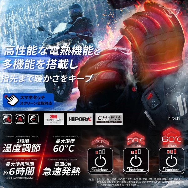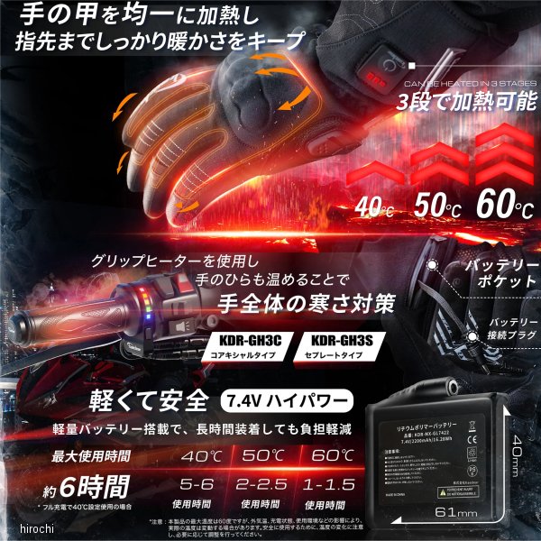 カエディア Kaedear 電熱グローブサイズ:Sサイズ詳細:手の長さ/18.0cm、中指の長さ/7.5cm、手平幅/18.1cm、手首長さ/11.1cm、手首幅/32.3cm【素材】3Mシンサレート、HIPORA、CH-Fitアウターシェル:ナイロン78%、ポリウレタン9%、スパンデックス7%、羊革6%ライニング:ポリエステル100%プロテクター:熱可塑性ポリウレタン100%バッテリー:7.4V/2200mA(品番 KDR-MX-GL7422)、PSEマーク内容:グローブ本体、バッテリー、充電ケーブル【仕様説明】MAX40℃(5-6時間)、MAX50℃(2-2.5時間)、MAX60℃(1-1.5時間)の3段階温度調節が可能。電源ONで即座に発熱する急速発熱機能を搭載し、快適な暖かさを提供します。グリップヒーターでは温められない手の甲を均一に加熱し、指先まで温めます。最大使用時間は約6時間ですが、外気温や充電状態、使用環境によって温度や持続時間が変動する場合があります。安全に使用するために温度の変化に注意し、必要に応じて調整を行ってください。※別途グリップヒーターを使用し、手の平も温めることでより快適に走行いただけます。HIPORA防水素材が雨の侵入を防ぎながら内部の湿気を効率的に排出。3Mシンサレート中綿が優れた保温性を発揮し、厳しい冬でも快適です。全指スマホタッチスクリーン対応で、グローブを外すことなくスマートフォンの操作が可能。ナックルプロテクターとパームスライダーを搭載し、転倒時の衝撃を吸収・緩和。ジャケットの袖を手首に入れてベルトを締めることで、走行風の侵入を防ぎ、冬のライディングをより快適にサポートします。一般的な冬用グローブとは異なり、柔軟性に優れた設計で、握る際に握力への負担を軽減。長時間の使用でも疲れにくい快適な着用感を実現しました。また、適所に採用されたゴートスキンがプロテクターと連携し、転倒時の保護性能をさらに向上。薄く軽量でありながら、高い保温性を兼ね備えています。また、リフレクタープリントが夜間の視認性を向上し、安全なライディングをサポートします。アクセントライン入りの滑り止め加工で操作性を向上させ、スポーティーなステッチデザインが外観に洗練された印象を与えます。※新品時はグリップの材質によって滑りやすく感じることがあります。※ワンサイズ上をお選びいただくことで快適に着用できます。インナー手袋を使用される場合もワンサイズ上をお選びください。