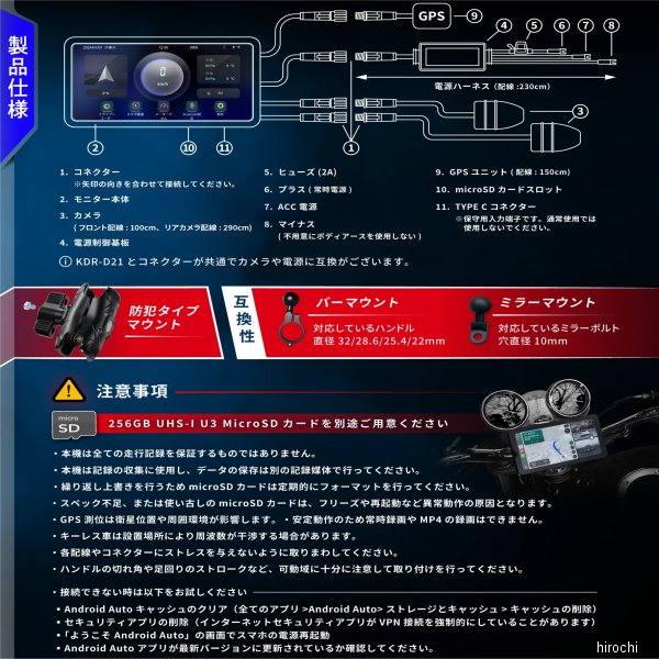 カエディア Kaedear スマートレコードディスプレイ ドライブレコーダー付きCarplay/AndroidAuto対応5Ghz Wi-Fi(屋内W52と屋外W56DFSモードの切替式)※ルーフの有無に対応。hone要件: iPhone 6S/iOS13以上。Android要件:Android11以上(格安スマホは接続されない場合があります。)接続方法:Bluetooth接続するとWi-Fiにつながり自動的にBluetoothは切断されます。次回から自動接続。※モバイルデータ通信を使用します。インカム接続方法:スマホと接続して使用します。 ※本製品はミラーリングモニターです。スマホがPCの役割を行い、モニターやインカムは、PCモニターやスピーカーの様に、周辺機器としてスマホに接続します。【ドライブレコーダー】ループ録画:1/2/5分※トラブル防止のため常時録画は設定できません。記録フォーマット:動画H.264TS※トラブル防止のためMP4は設定できません。イベント録画:Gセンサーが衝撃を感知すると自動ロックされ上書きを防止します。駐車監視機能:待機0.001W、録画10W、撮影時間10秒microSDカード:最大256GB/UHS-I U3再生方法:本機/PC/スマホアプリGPS:5hzデュアルバンド※シングルバンドと比べて2倍の位置情報を取得録音:ON/OFFタイムスタンプ:ON/OFF【カメラ】イメージセンサー:SONY STARVIS IMX-307※暗視能力に優れ、夜間の映像も肉眼よりも明るく鮮明に記録します。明暗補正:HDR/WDR※逆光による白とびやトンネルでの黒つぶれを補正。視野角:136°F値:1.8解像度:FHD(1920×1080P/200万画素)フレームレート:27.5fps※全国のLED信号対応。【モニター】iPモニター:5.5インチ本体寸法:143×77×26.1mm防水レベル:レインコンディション対応 IP67液晶:IPSタッチパネル※タッチ感度もよく雨に反応しにくい。輝度:1100Nit※さらに明るく昼間のツーリングでも映像が見やすい。対応温度:-20~70℃※モニター背面のヒートシンクが熱を効率よく排出。スピーカー:8WHUD:速度/日時/方位/空気圧/高度/最大速度マウント:1インチボール/Airマウント※すでにお持ちの1インチボールマウントと互換性があり、衝撃やエンジン振動を軽減し、製品寿命向上。動作電圧/電力:DC9-36V/10W※12V/24Vバッテリー車対応。【配線】電源ハーネス:230cm(常時、ACC、マイナス)フロントカメラ:100cmリアカメラ:290cmGPS:150cm※暗電流が発生するため、長期間走行しない場合は常時とACCの2本をACC電源に接続してください。【その他設定機能】空気圧センサー:空気圧単位KPA/Bar、温度単位℃/°F※整備業界標準KPA※ボタン電池の定期交換が必要です。頻繁な付外しはセンサーのパッキンが消耗します。バックカメラ:ON/OFF音量:手動調整明るさ:手動/自動調整サウンド出力:出力先をスマホ(インカム)またはモニターに切替可能時計:GPSの測位やスマホと接続する事で正確な時刻が表示されます。ファームウェア:公式サイトから書換用microSDカード、またはダウンロード版で更新してください。