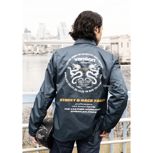 バンソン VANSON 2026年春夏モデル コーチジャケット 2XLサイズ NVサイズ:2XLカラー:ネイビー素材:ナイロン+PUコーティング本体生地は、防水撥水機能を高めるナイロンPUコーティング。裏地にはメッシュ素材を採用。装飾は刺繍仕上げのワッペンとプリントデザイン。ドローコードで裾幅の小生も可能。襟裏にはバタ付き防止用のドットボタンを装備。肩口部分にはアクションプリーツを採用。肩・肘・脊髄には標準仕様でプロテクターが装備されています。さらに事故で一番ダメージを受ける胸部にも標準でプロテクターが装備されています。【装備・詳細】● 裏地にはメッシュ素材を採用。【サイズについて】※サイズは商品の実寸を計測した数値です。※サイズには多少の誤差があります。 体寸法の目安としてご利用ください。※デザインや素材により着用感が異なります。