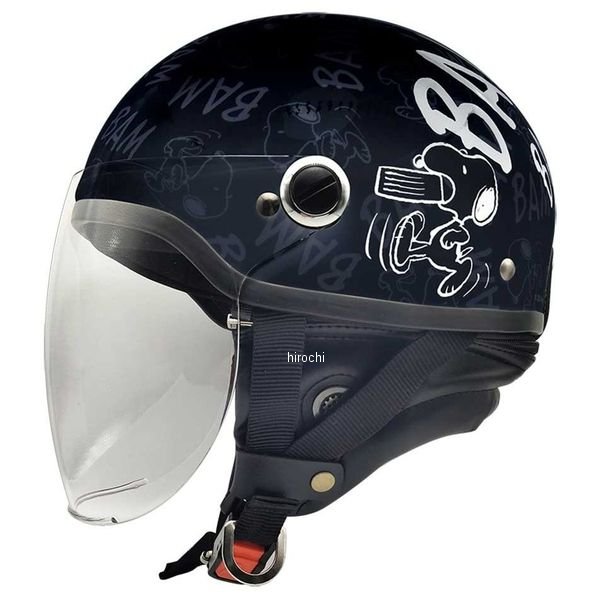 アークス AXS SNOOPY BAM BAM バムバム シールド付 ハーフヘルメット ブラック 光沢あり FREEカラー:ブラック 光沢ありサイズ:FREEサイズ(57~59cm)大きなスヌーピーが走り出す!! アクティブモードのオノマトペ モノクロデザイン 光沢仕様 ・ウキウキ動くスヌーピーをモチーフにしたモノトーンのデザイン ・ホワイトとブラックの2カラー ・左右で違う絵柄のデザイン ・125cc以下専用ヘルメット ・雨、風、ほこり、日光から顔を守るライトスモークカラーシールド付! ・首の後ろ側も日焼けからしっかりガードするイヤーカバー付き、ファスナータイプで脱着可能 ・サイズ調整用のスポンジ付・SG規格適合品(125cc以下 ミニバイク専用全排気量対応) ・JIS2007安全規格対応
