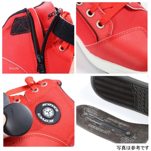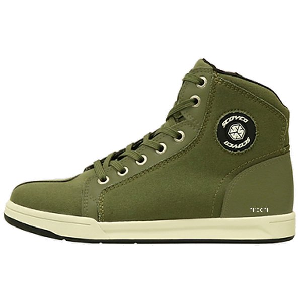 スコイコ SCOYCO カジュアルライディングシューズサイズ:40(25.5cm)カラー:ミリタリーグリーン素材:キャンバス【仕様説明】カジュアルな雰囲気で、スニーカーのようなバイク用ライディングシューズ。踵から土踏まずにかけてスチールプレートと樹脂プロテクターを内蔵。歪みの少ないソールは足首のひねりを防止。つま先部分は曲げやすようにスリットが入れられており、安全性と歩きやすさを併せ持つ。また、ソールも普通のスニーカー並の厚みでクッション性も備えており、キャンプ場などの不整地でも足が疲れにくいです。くるぶし部分の両側とかかと部分全体に樹脂プロテクターが内蔵。つま先はシフトパッドと樹脂プロテクターのダブルでガード。サイドジッパーで足首からソール付近まで大きく開き脱ぎやすく、また着用後は脱げにくい。しっかりとしたキャンバス地は、カジュアルな日常着にも合わせやすく、履いたときの軽さも抜群。【機能】・つま先、かかと、くるぶし部分にプロテクター装備・フトパッド装備・靴底(アウトソールとインソールの間)にスチール製のシャンクを配置