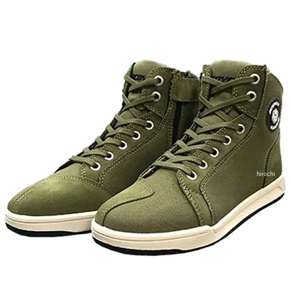 スコイコ SCOYCO カジュアルライディングシューズサイズ:43(27.5cm)カラー:ミリタリーグリーン素材:キャンバス【仕様説明】カジュアルな雰囲気で、スニーカーのようなバイク用ライディングシューズ。踵から土踏まずにかけてスチールプレートと樹脂プロテクターを内蔵。歪みの少ないソールは足首のひねりを防止。つま先部分は曲げやすようにスリットが入れられており、安全性と歩きやすさを併せ持つ。また、ソールも普通のスニーカー並の厚みでクッション性も備えており、キャンプ場などの不整地でも足が疲れにくいです。くるぶし部分の両側とかかと部分全体に樹脂プロテクターが内蔵。つま先はシフトパッドと樹脂プロテクターのダブルでガード。サイドジッパーで足首からソール付近まで大きく開き脱ぎやすく、また着用後は脱げにくい。しっかりとしたキャンバス地は、カジュアルな日常着にも合わせやすく、履いたときの軽さも抜群。【機能】・つま先、かかと、くるぶし部分にプロテクター装備・フトパッド装備・靴底(アウトソールとインソールの間)にスチール製のシャンクを配置