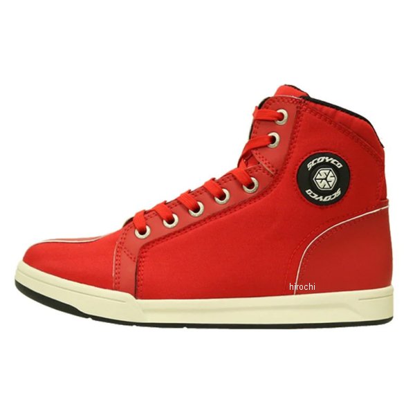 スコイコ SCOYCO カジュアルライディングシューズサイズ:40(25.5cm)カラー:レッド素材:キャンバス【仕様説明】カジュアルな雰囲気で、スニーカーのようなバイク用ライディングシューズ。踵から土踏まずにかけてスチールプレートと樹脂プロテクターを内蔵。歪みの少ないソールは足首のひねりを防止。つま先部分は曲げやすようにスリットが入れられており、安全性と歩きやすさを併せ持つ。また、ソールも普通のスニーカー並の厚みでクッション性も備えており、キャンプ場などの不整地でも足が疲れにくいです。くるぶし部分の両側とかかと部分全体に樹脂プロテクターが内蔵。つま先はシフトパッドと樹脂プロテクターのダブルでガード。サイドジッパーで足首からソール付近まで大きく開き脱ぎやすく、また着用後は脱げにくい。しっかりとしたキャンバス地は、カジュアルな日常着にも合わせやすく、履いたときの軽さも抜群。【機能】・つま先、かかと、くるぶし部分にプロテクター装備・フトパッド装備・靴底(アウトソールとインソールの間)にスチール製のシャンクを配置