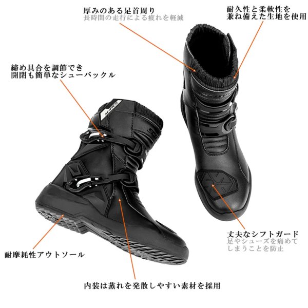 スコイコ SCOYCO ライディングブーツ Touringサイズ:40(26.5cm)カラー:ダークブラウン【仕様説明】・耐久性と柔軟性を兼ね備えた生地なので、履き始めから足に馴染みます。・歪みの少ないソールは足首をひねりを防止。・靴底のシャンク(踏まず芯)が正確なステップワークをサポート。【機能】・つま先、かかと、くるぶし部分にプロテクター装備・シフトパッド装備・靴底(アウトソールとインソールの間)にスチール製のシャンクを配置
